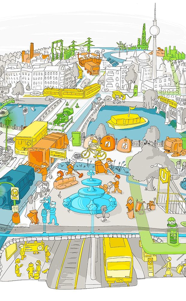 Zusätzlich kann für jeden einzelnen Ver- und Entsorgungsbereich noch ein eigenes Wimmelbild heruntergeladen werden. Die Illustrationen sind Teil der Bildungsunterlagen von KlimaMacher und zeigen vereinfacht, welche Aufgaben die Berliner Infrastrukturunternehmen in den Bereichen Abfall, Energie, Mobilität und Wasser in der Stadt übernehmen. Was bedeutet das für die Umwelt- und Lebensqualität der Bürgerinnen und Bürger? Finden Sie es heraus! Es gibt viel zu entdecken.